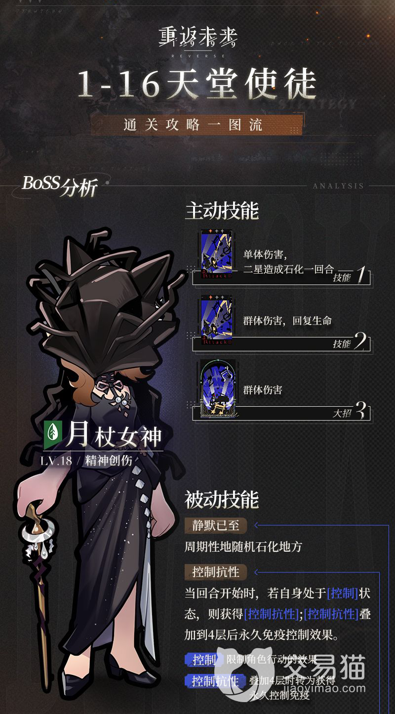 这关的boss月杖女神,他的特点就是自身拥有很强的控制能力,并且自己还不受控制。所以合理的躲避boss的石化技能,是通过这关的关键。他不仅主动技能是石化,可以默认石化阵容的前排,而且还会有随机石化阵容内角色的被动。但是被动的石化在石化之前是有提示的,所以玩家一定不要将自己的输出角色放在即将要石化的位置上。
