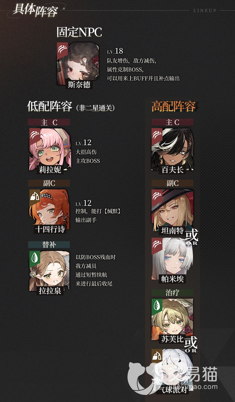 由于这个boss血量很高,小编建议玩家携带两个c位,分别是利拉尼和十四行诗。前者就是一个数值怪,不仅克制着boss,还可以造成很高的单体伤害,非常适合攻击boss。而后者不仅可以攻击,而且还可以为整个团队进行攻击力的增益。