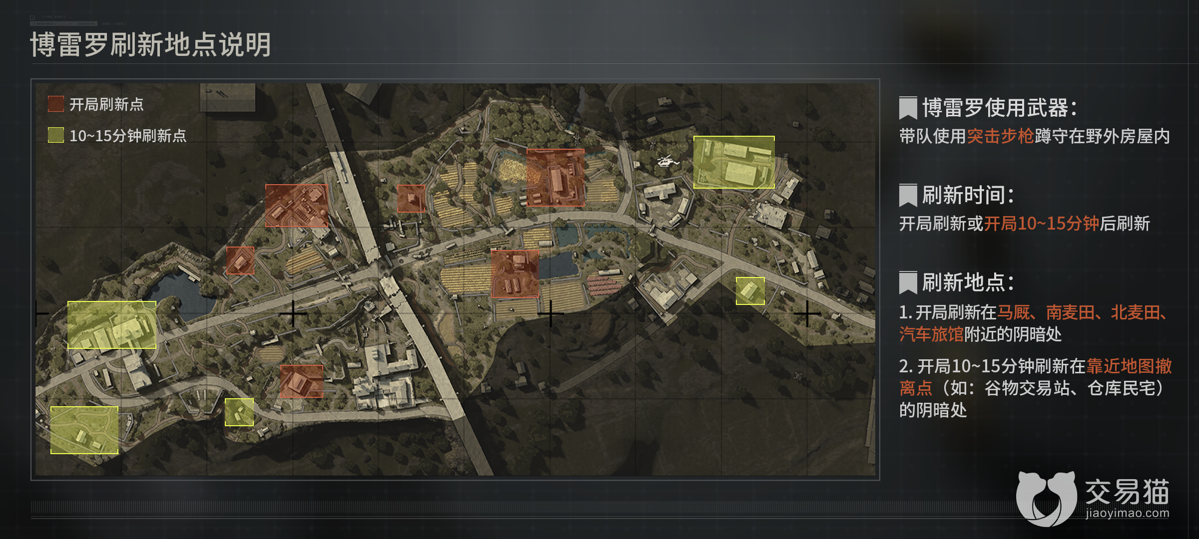 两者的刷新时间要么开局刷新在地图中心区域,要么在开局10-15分钟之后刷新在靠近地图撤离点的位置,小伙伴们一定要留意地图的阴暗处。