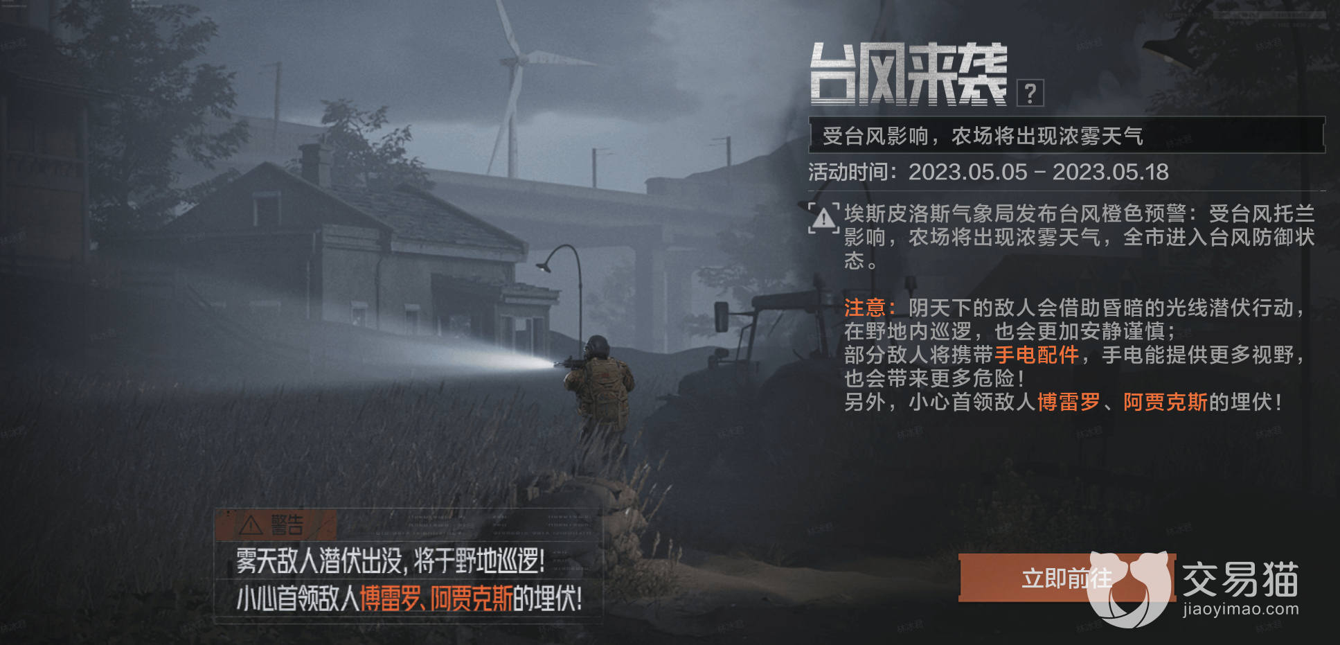 不过限定道具X300U-A也会在所有地图产出,拥有这个道具之后就能够更好的发现敌人的踪迹,不过提供更多视野的同时,危险也会并肩存在,有些敌人也会拥有战术手电配件,首领博雷罗和阿贾克斯也会出现在雾天的农场,小伙伴们可要小心不要中了首领的埋伏哦。