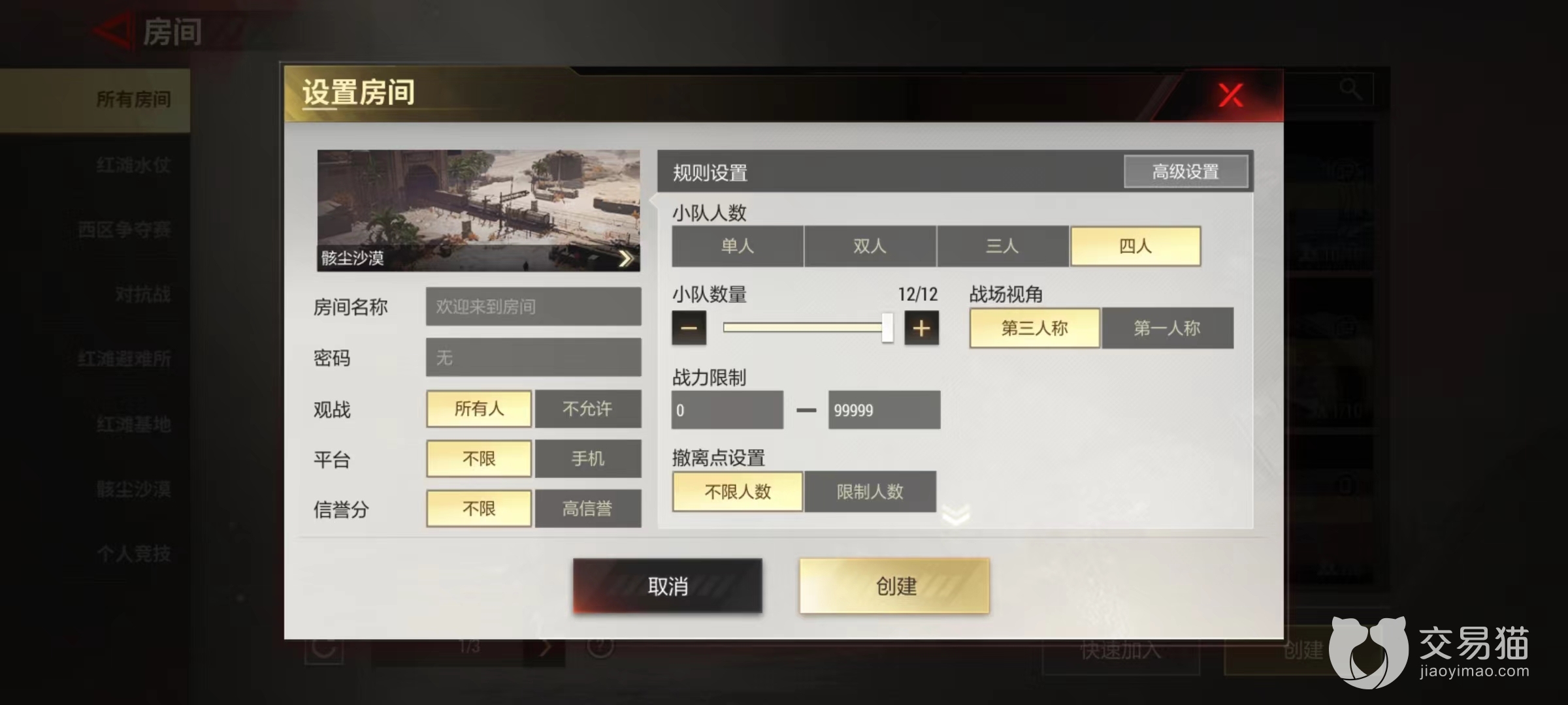 当玩家等级达到10级的时候,就可以进入到沙漠中进行对战,这是视野极其开阔的野外作战地图,加入形式上比较自由,可以自己匹配也可以加入房间,在建立房间时候,单人、双人或三人、四人等都可以,这样体验上就更加自由。当然4排才是最佳模式,越是开阔地形,越适合与多名玩家一起配合。