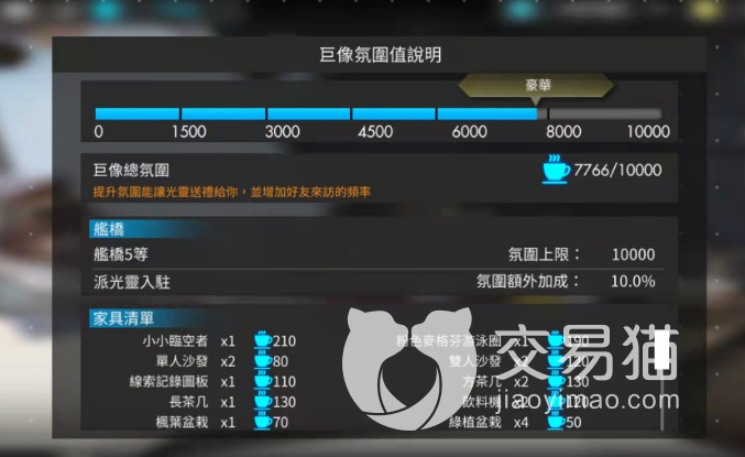 家具的除了可以用来改变巨像的外观,其最大的用处就是可以提升巨像的氛围值了,巨像的氛围值越高的话,光灵们赠送道具给玩家的几率就会越高,光灵们赠送的礼物除了有白夜币外,有时还会赠送珍贵的光珀哦!这也是玩家们主要获得光珀的来源之一。