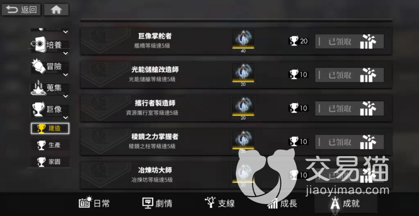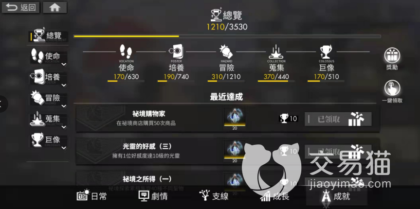 成就主要分为“使命”“培养”“冒险”“收集”以及“巨像”五大板块,使命相关的成就主要靠等级,收集的白夜币以及光珀还有还有数量来判定,比较简单,“培养”则是根据光灵们的等级,数量以及好感度来判定,玩家们只需要提升使用角色的练度就可以了。