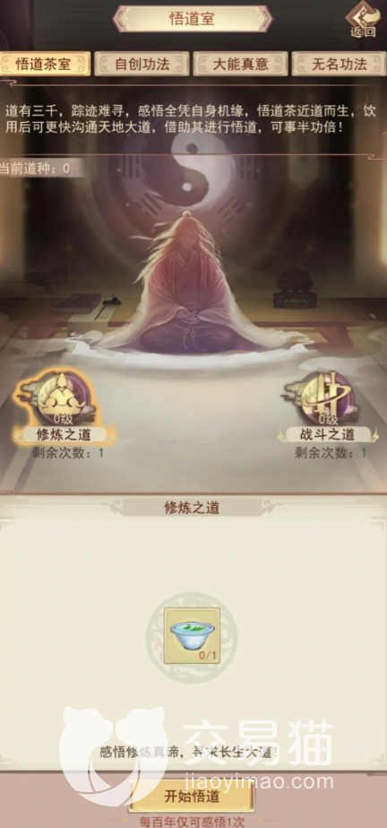 上天之后,一般情况下,洞府都会开一个悟道茶室,每百年可以感悟一次。基本上每一次喝茶都会获得一个稻种以及相应的属性和修为,前期情况下建议喝满,每种喝满十杯的话会给一个功法。尽量前期全部喝完,如果实在不行的话,先喝战斗方面,把战斗功法拿到。