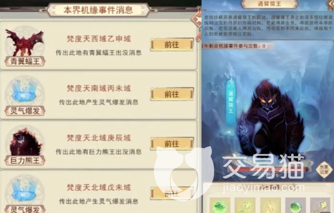此外,在游历探索过程中,还会有遇到一些世界boss,都是一些非常不错的强敌,同时也是游戏中获得三界高品法宝的主要途径。建议各位玩家们遇到这些boss之后,找一些好友或者其他路人队友组队攻略,这样能更有把握获取boss攻略的胜利。奖励会根据伤害量进行比例的分配,获得的材料也可以在仙宗门派的宝库换一些高级别法宝。