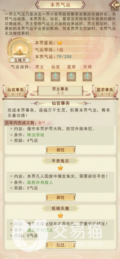 气运,在游戏地图当中如果该地图有玩家们成为界主,而不是AI主导的话,那么该地图便会开放气运系统。在这张地图当中,担任界主星君以及相关等较高级别官职的玩家们可以获得海量契约,气运可以积累一定数量提升,这个地图官位的相应工资以及一些资源收益,所以尽量玩家们拿到官位之后多做些任务,提升自己的气运。