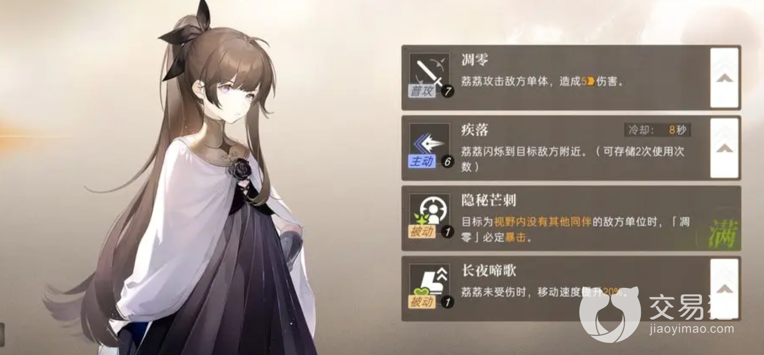 灵巧系当中除司阳以外,最好用的角色。拥有着相当不错的技能组合,伤害方面很高。算是游戏当中作为下手的平替,虽然没有那么变态的隐身能力,但如果跟队友配合的好的话,还是能发挥相当不错的作用的。