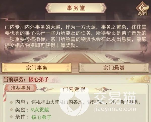 这个地方里面有很多的任务,大家可以在这里接任务来获取贡献点,里面主要分成日常任务,特殊任务,日常任务主要就是一些宗门里面的事情,比如巡视宗门大阵和宗门内地,管理内务以及外门弟子事务等,特殊任务指的是宗门悬赏。