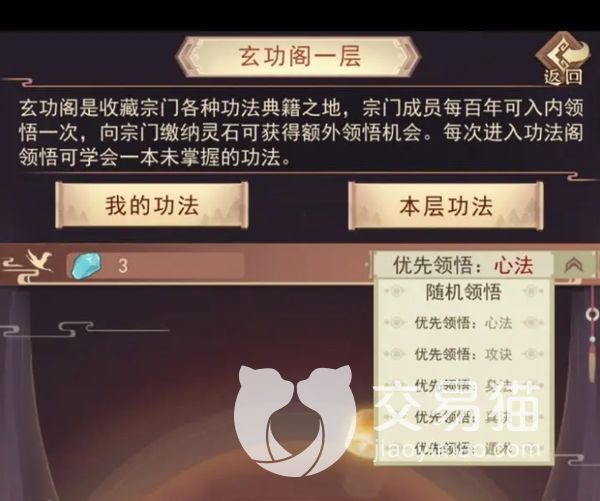它里面包括玄宫阁,玄天阁以及玄术阁,都是练习功法的地方,其中玄宫和玄术每天都会有一次免费进入学习的机会,白嫖的学习机会大家可千万不要错过了。其他时候都是需要用灵石进行学习的,不同阶段所消耗的灵石是不同的,比如炼气期只需要1000灵石就能学一些,而元婴期的话,需要100000灵石四星。
