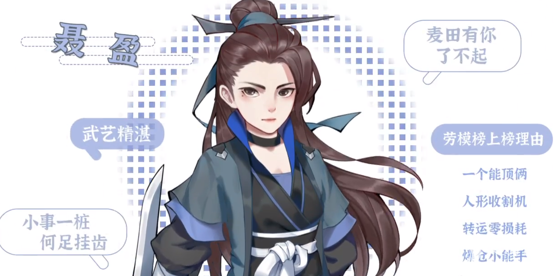 聂盈在游戏当中非常适合分配去种植,这个角色被称为麦田小能手,玩家分配之后,该角色能够帮助玩家快速的进行收割,并且零损耗。因此在游戏当中种田这方面聂盈一个顶俩!