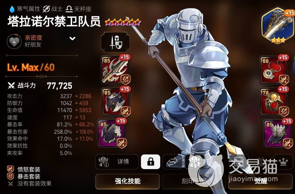这个其实才是真正意义上的水桶哥,有破甲有自身强化buff单靠自身就能打出伤害的全能战士。在pve里打火属性讨伐、远征都有很好的就业环境,作为破甲工具人或者副C都不成问题。装备用“速度夹击、速度命中”,这2个必带,不用做夹击6件套。神器用小丑、剑鞘、龙牙都可以。