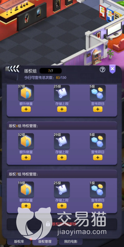 此外,还需要注意版权方面的提升,玩家在游戏中通过艺人拍的影片,如果版权方面出现问题的话,那么很有可能搞不了多少收益。建议各位玩家们点销量和储存上限,宣传部门可以放后面一点,额外销量点到30级加八次宣传次数就可以了。储存上限存到八个小时也差不多,就是六档电影25集左右的程度,宣传项目的话,点到五级会出一个加流行概率,很强,再往上的话就有点浪费资源。