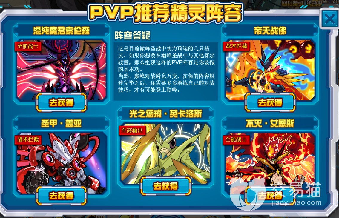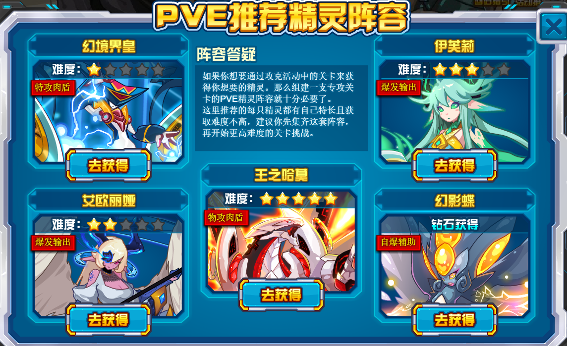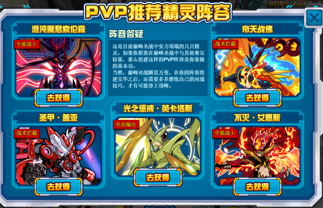 这套pve阵容的组建还是尤为关键的,因为影响到后续pvp阵容的获取,下图这一套就是目前比较强悍的pvp阵容,不过由于其中一些精灵的技能过于强势,所以导致它们常常处于巅峰竞技的ban位上,因此建议大家有条件的话还是全部获取一下,这样在后续打巅峰赛的时候也不会太吃亏。