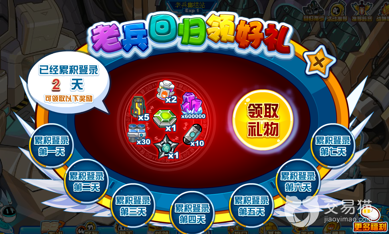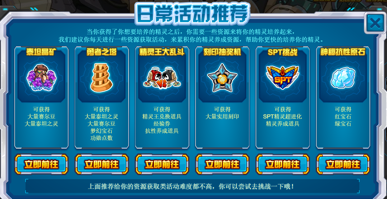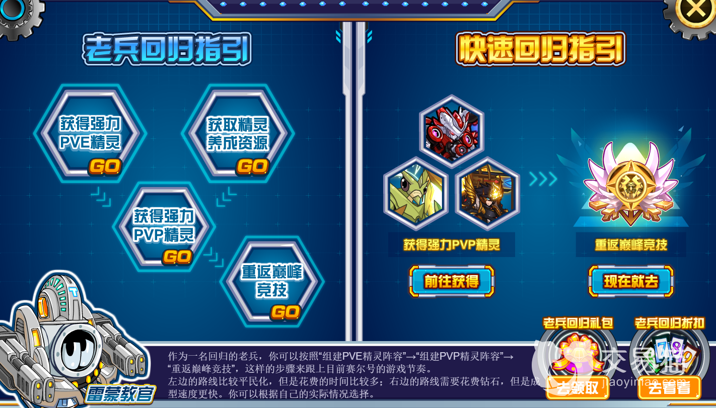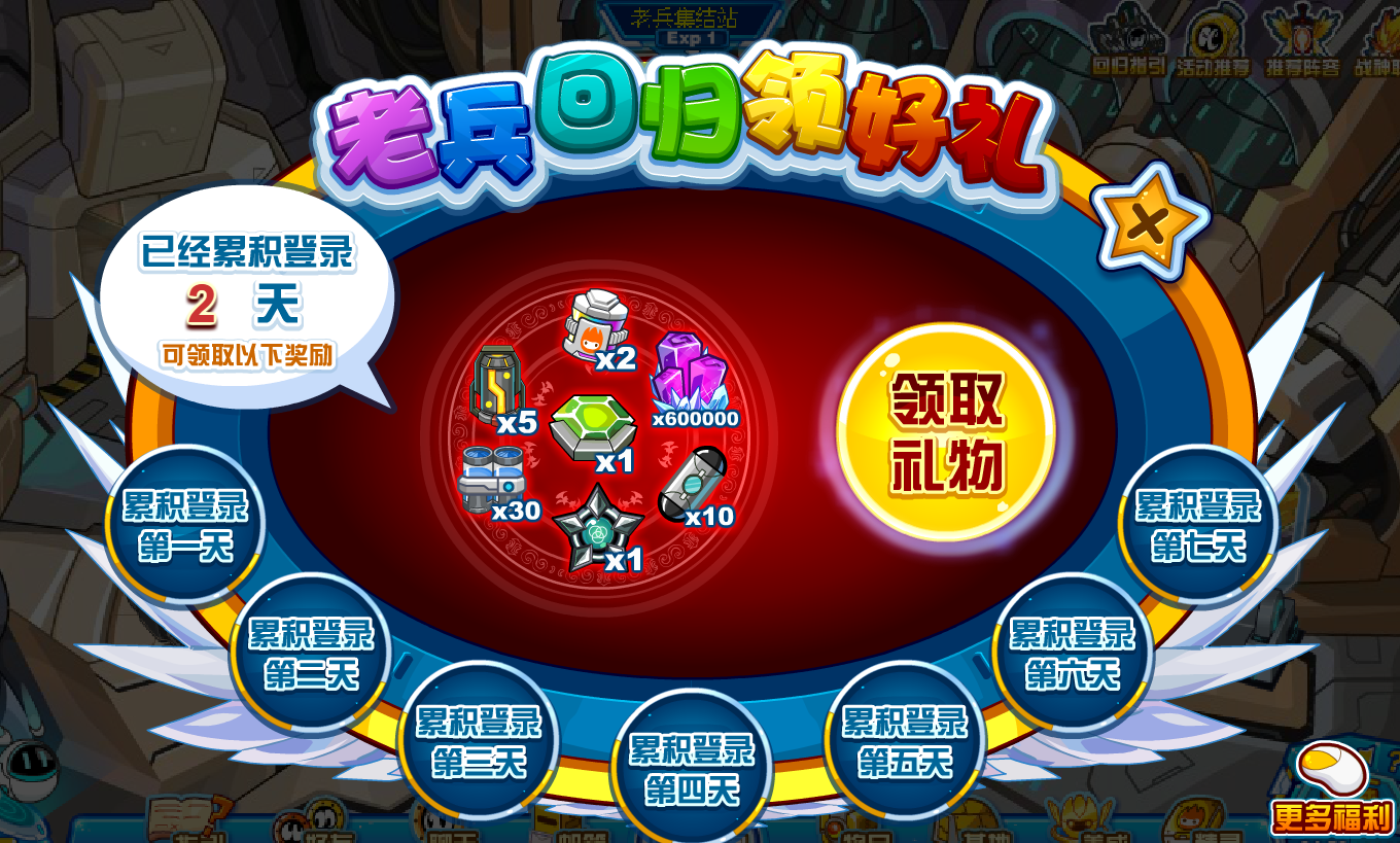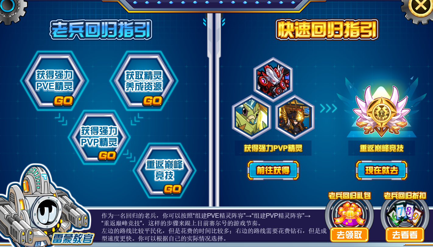 资源获取:回归的话主要有两种资源获取途径,第一种就是老兵回归礼包,回归后的七天每天都可以领取超多的资源,这些资源包括经验券,无敌胶囊和各种强力刻印与道具,这些都可以迅速提升你精灵阵容的等级和实力,而且它只需要上线后点一下就能领,参与的门槛可谓是非常低了。