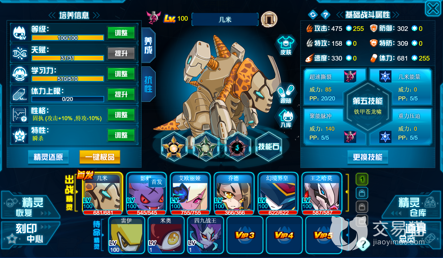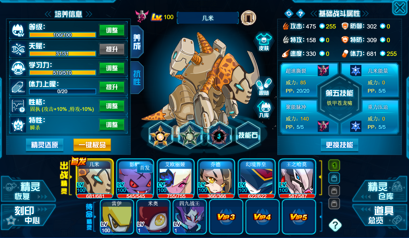 精灵推荐:由于现版本攻克强势精灵的pve阵容也有一定要求,所以在这之前需要先培养一只自己已有的精灵去完成pve队伍精灵的搜集,这里最推荐大家练的就是“几米”,这个精灵是老兵回归后赠送的,而且在性格,等级和学习力上都已经默认刷到极品,大家只需要了解下它技能的效果,然后进行合理连招即可,大多数情况下都可以无脑放三次几米能量进行承伤和自我增幅,之后再用第五技能带走敌人。