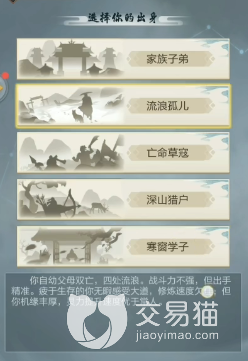 开局选择:游戏开局有五种出身可以选择,不同的出身会带来不同的效果增益。这里只有两个职业有基础属性达到了十点,分别是10机缘的流浪孤儿,所以想快速获取中后期体验的朋友推荐选择它,它的命中更加精准,提升灵力的效率更高,缺点就是前期初始战力低了点。