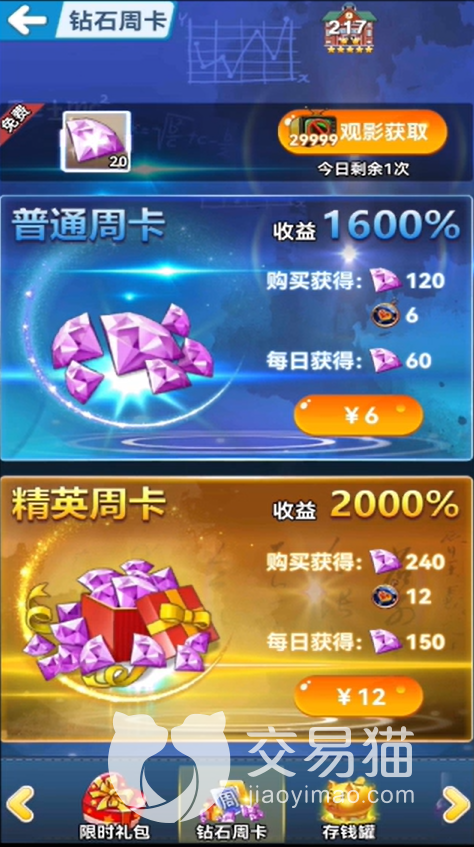 第二种就是在周卡界面的上方通过观影获取,这种方法也是一次二十,不过每天只能去领取一次,而且相比消息中直接派出的钻石红包,它这种方法会比较耗时间。