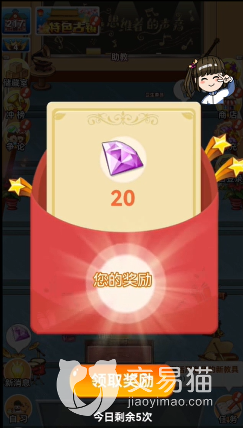 钻石获取:大部分的资源都可以通过任课,考试和做任务等环节来获得,所以其中对于平民玩家来说比较稀缺的反而是那需要氪金才能获得的钻石,钻石本身其实也是有白嫖方法的,目前主要有三种,第一种就是通过教室左下方的新消息来领取,每次领取有20钻石,一天最多领取五次。