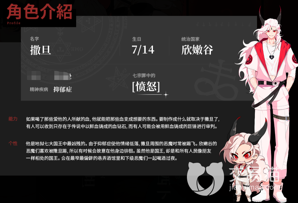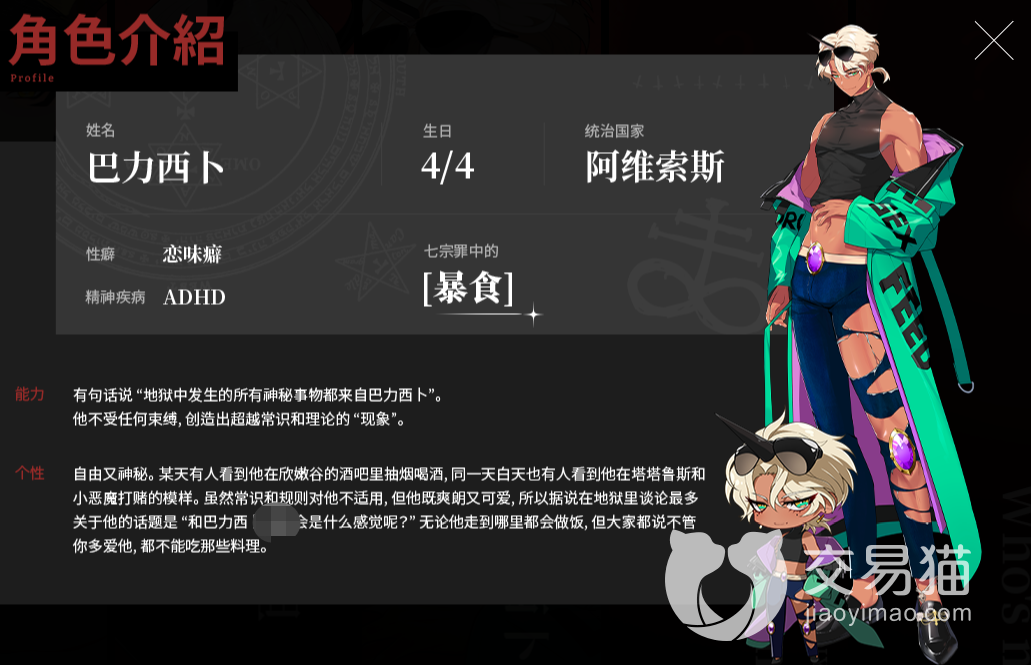 游戏里面稀有度最高的七宗罪恶魔,是统治着七十二只恶魔的七位君王。其中四位恶魔是玩家初始和选择的传奇恶魔,他们分别是玛门、撒旦、利维坦与巴力西卜,分别对应不同的个性与能力,在角色宠爱页面上有专属角色卡面立绘展示,包括道具互动、语音以及动作等,精美程度对得上他们的稀有度。