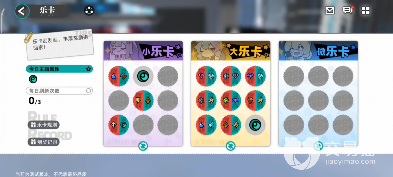 2、该系统分为了三个种类,分别适合大乐卡、小乐卡、微乐卡。其中大乐卡和小乐卡会固定带有和今日相关属性的,微乐卡则是需要刷新才行。该玩法的翻牌规则是依照乐卡面上的属性克制来进行的,需要参考当天的主题属性。