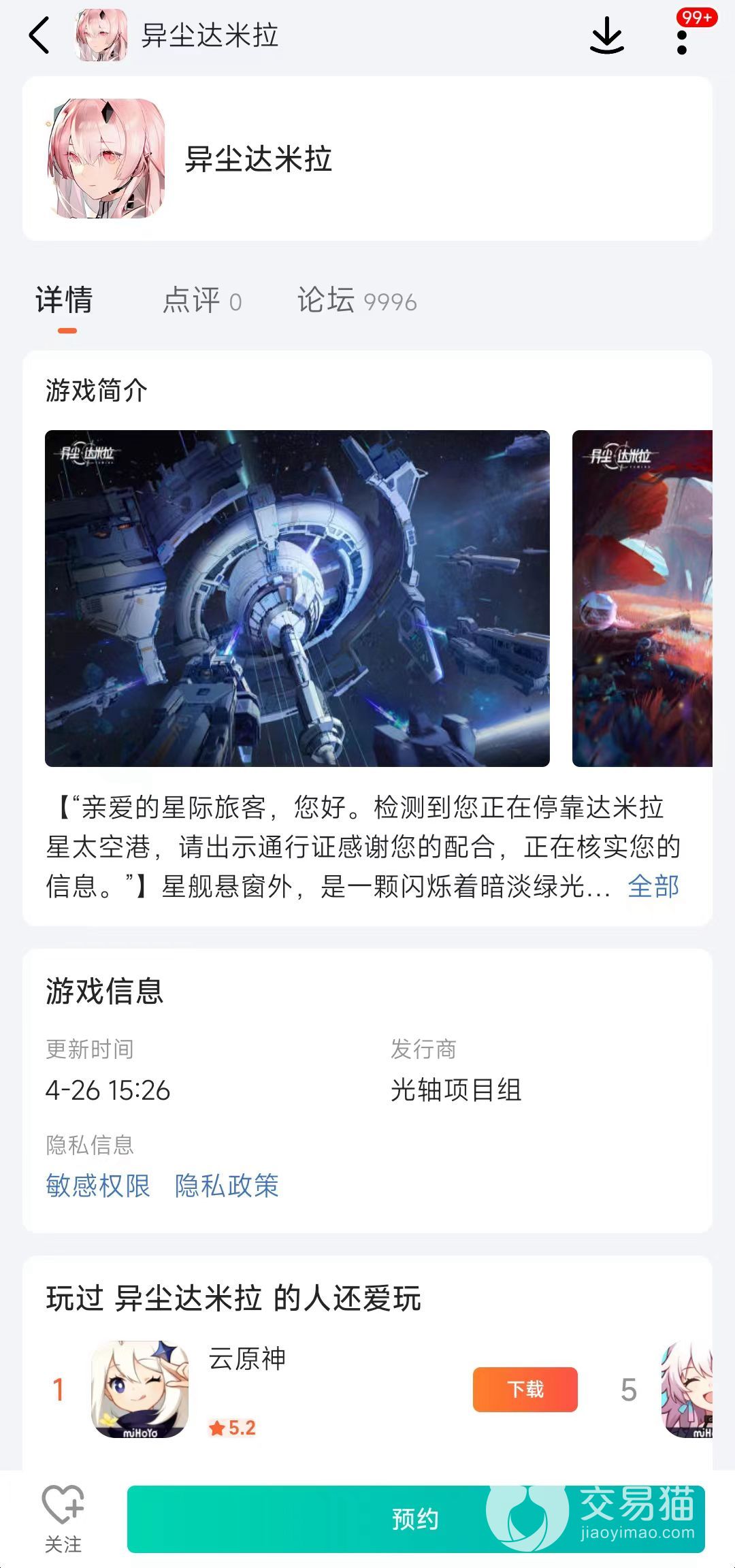 点击上方链接,就可以直接下载安装九游APP,然后我们进入九游app,直接搜索“异尘达米拉“进行预约,这样玩家就能够在游戏上线后第一时间收到关于游戏的最新动态和上线通知,第一时间体验这款游戏的魅力。