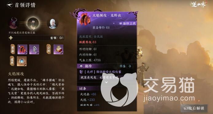 挑战火焰围攻关卡获得获得独珍上衣火焰围攻无烬衣,这件衣服穿戴之后可以在危机关头提升大量的火元素抗性,并且还同时提高穿戴者的火攻击能力。这个装备非常适合火属性的玩家来使用,可以大大提升玩家的输出能力。