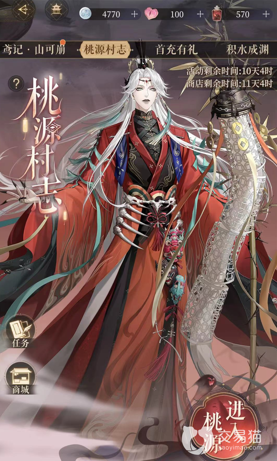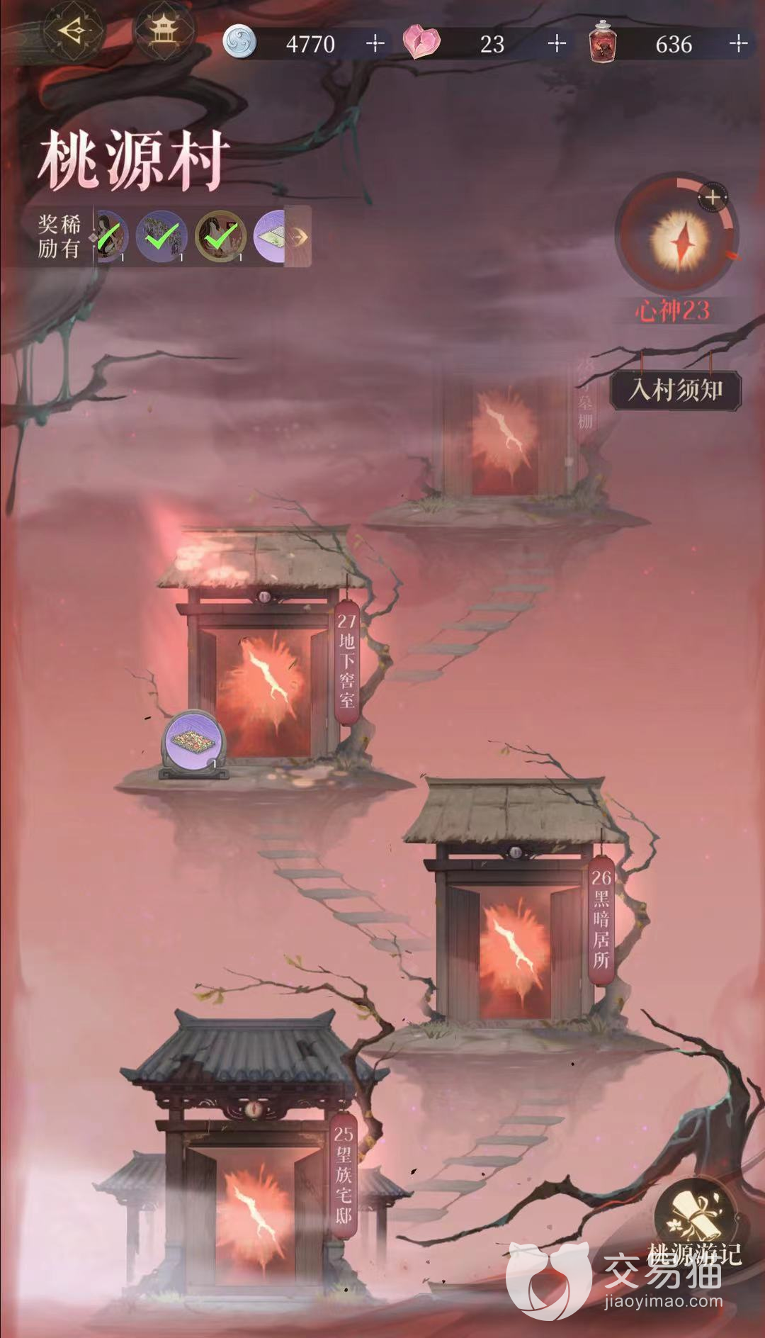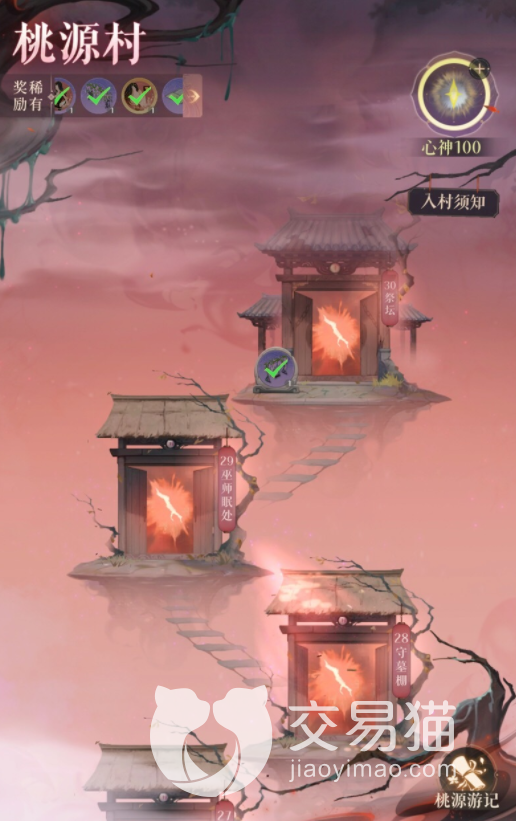 桃源游记分为普通游记与梦境,玩家的心神>30时点击关卡开门即可获得游记,需要全通30层才能收集完整。
