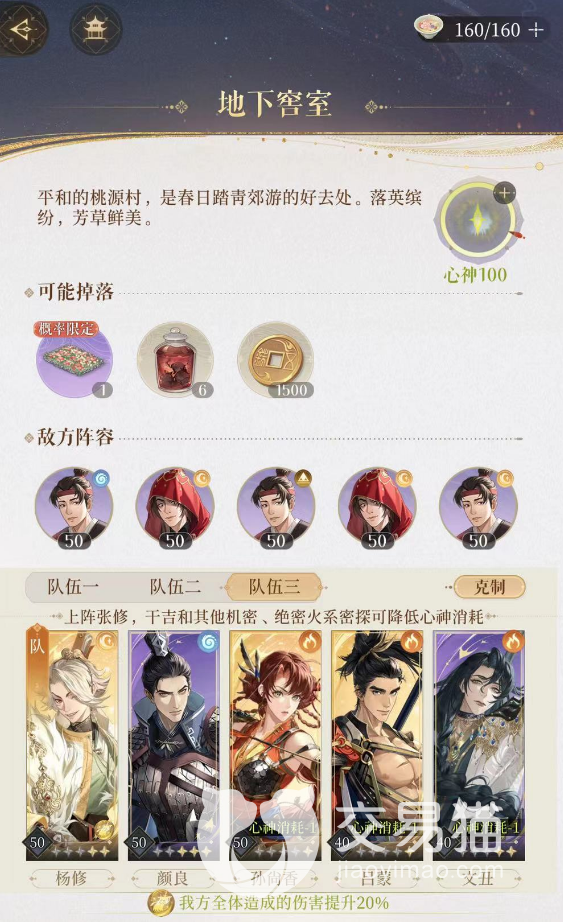桃源村内不使用游戏外的体力值,使用的是每10分钟恢复一点的心神值。可以使用活动道具桑落恢复心神值,普通桑落恢复20点,一坛桑落恢复60点心神值。而使用火属性特定密探:张修、干吉、孙权、孙尚香、郭解、陆逊、吕蒙、文丑,可以减少每一关需要消费的心神值。