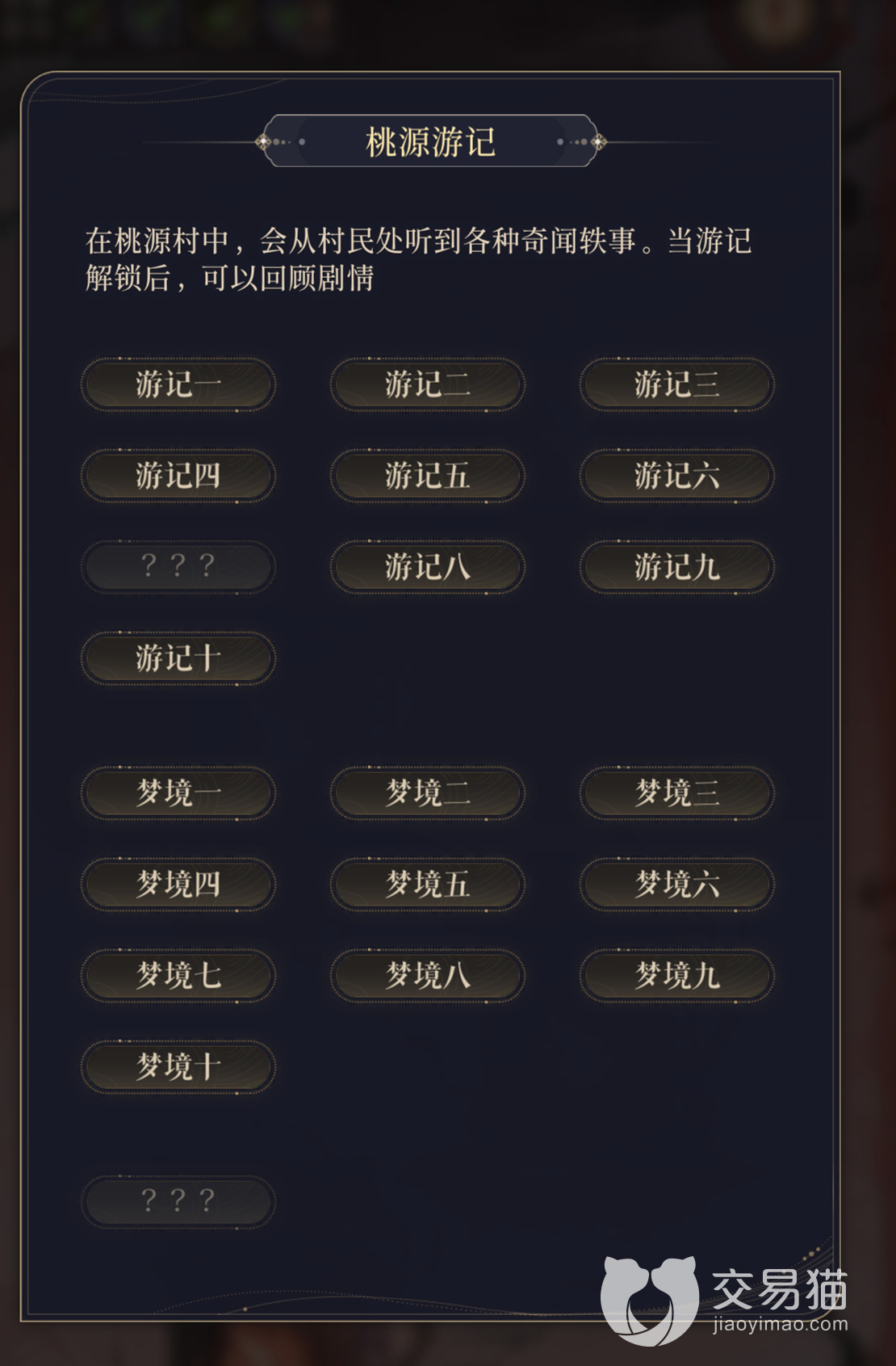 桃源游记是桃源村志里需要触发不同条件收集的剧情,在打桃源村副本中,玩家会从村民处听到各种奇闻轶事,收录游记解锁后,可以点击回顾剧情,逐渐还原出桃源村的真实面目。