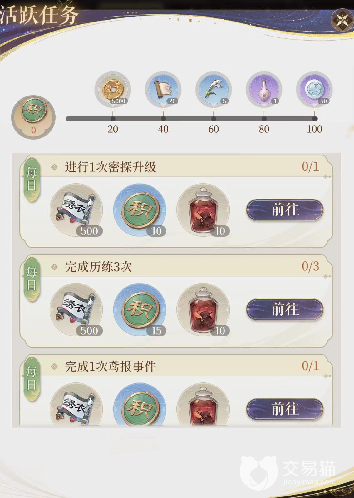 每日任务:进行一次密探升级、完成三次历练、完成一次鸢报、完成一次情报、收集一次据点、家具互动一次、相见互动一次、进行一次观星、消费120体力、赠送一次礼物(奖励桑落)、分享一次(奖励桑落)。每日任务优先做有桑落奖励的,其余任务在领取足够体力值时可做。另外每通关5层,都能收取一次葡萄奖励,加上每一关的首通葡萄,足够让玩家搬空活动商店。