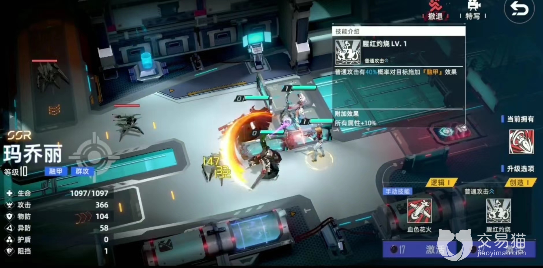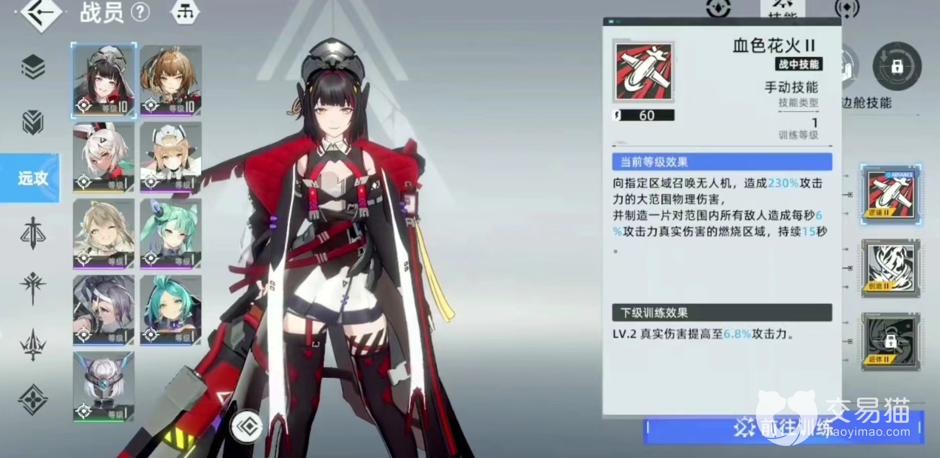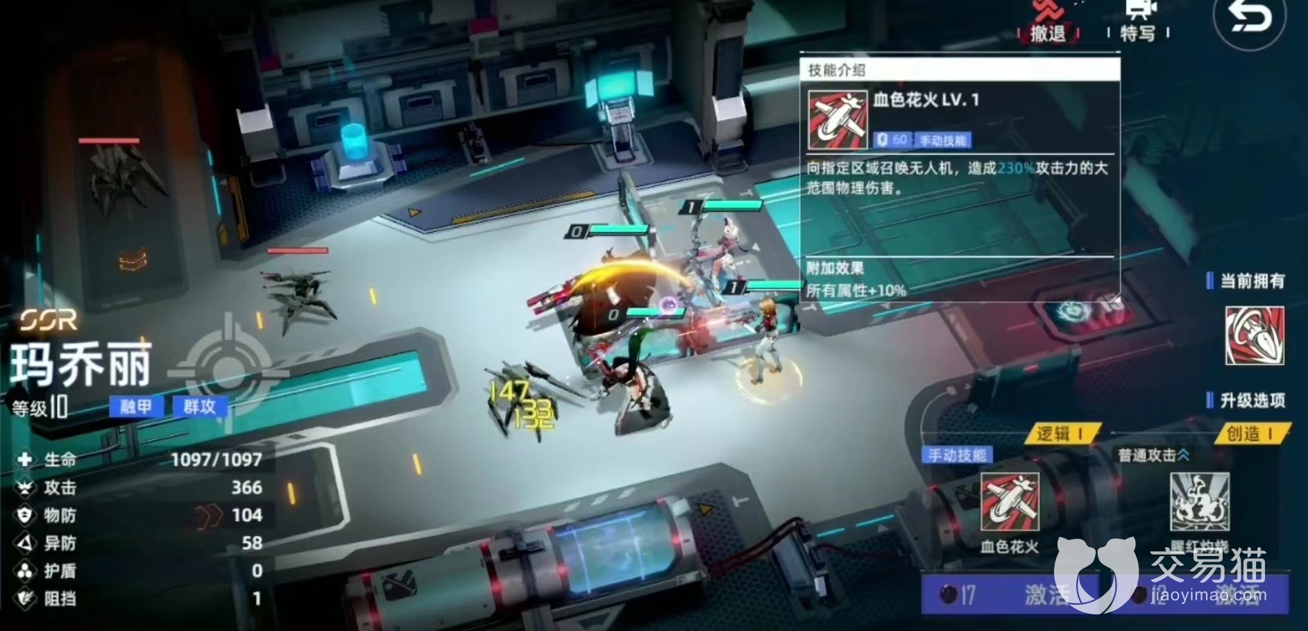 还有就是战中技能,手动技能血色花火,当这个技能处在第一阶段的时候,那玩家就根据敌人目标来指定一个地方,然后通过召唤无人机的方式去攻击敌人,这个伤害范围是很广的,并且可以给敌人造成300%的攻击伤害,当这个技能达到二阶级的时候,还可以对目标范围内所有的敌人造成一个很强的攻击伤害,同时还会触发到一个燃烧效果,而这个效果也是会持续15秒的时间。