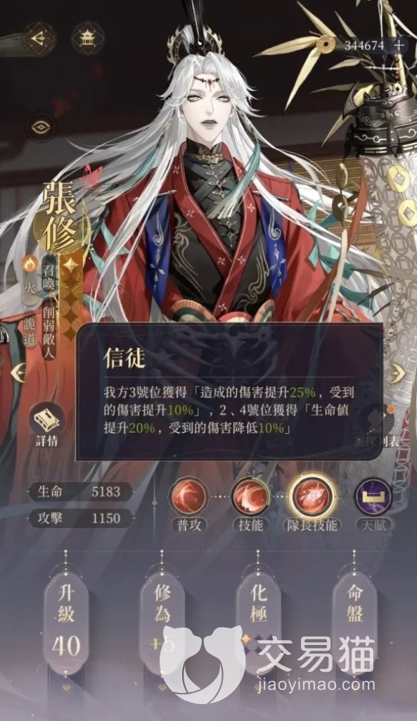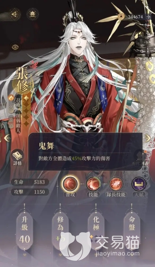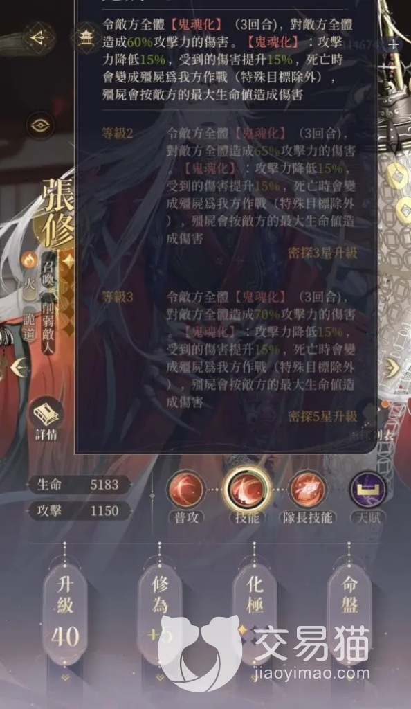 张修属于火属性的角色,在技能方面,普通攻击技能可以对敌人造成45%群体伤害。在其他技能上,拥有五格能量。可以对敌人造成鬼魂化,也就是三个回合死了,在对局中就会变为鬼魂。这样可以使得敌人的攻击力降低15%,并且提高敌人受到百分之十五的伤害。作为队长还会拥有队长技能,可以提升第三号位角色的百分之二十五伤害,但受到伤害也提升10%。提升二号位和四号位20%生命值,降低受到百分之十的伤害。
