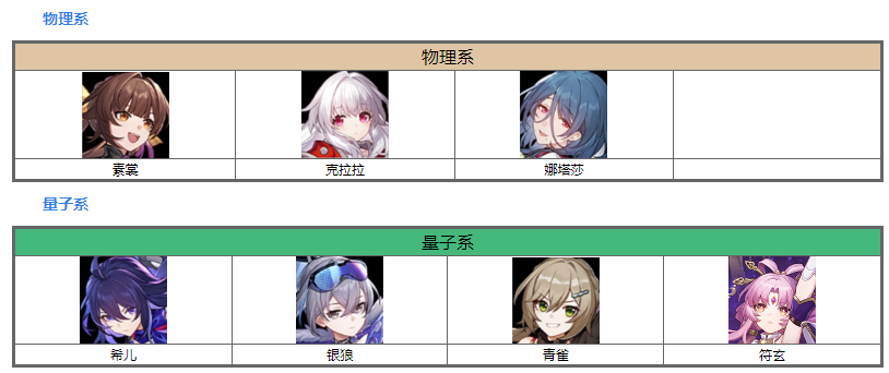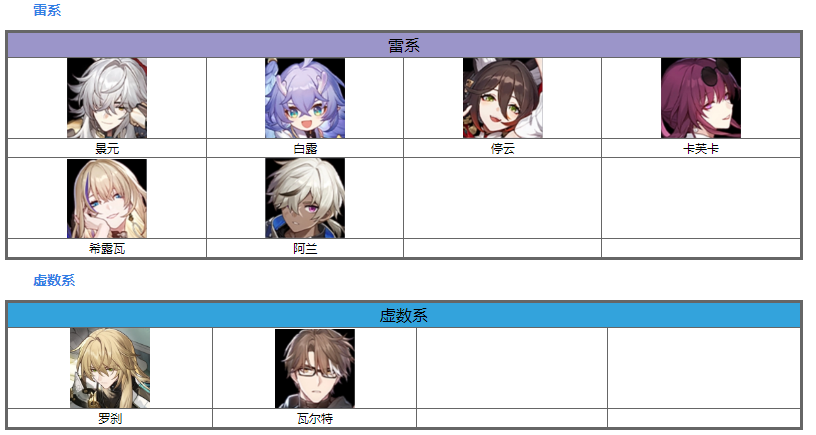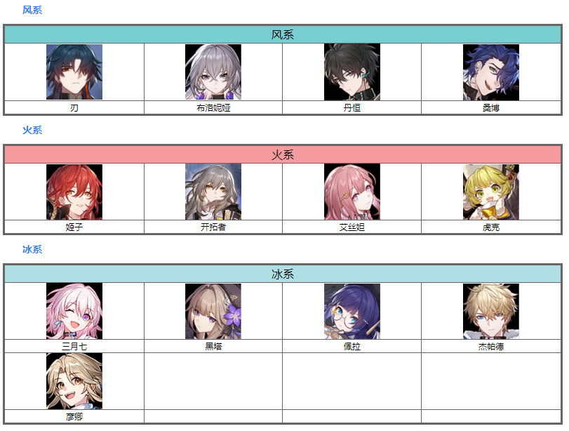 风系:刃、丹恒、布洛妮娅、桑博。火系:姬子、艾丝姐、开拓者、虎克。冰系:三月七、佩拉、彦卿、黑塔、杰帕德。雷系:景元、停云、阿兰、希露瓦、白露、卡芙卡。虚数系:罗刹、瓦尔特。量子系:希尔、青雀、银狼、符玄。