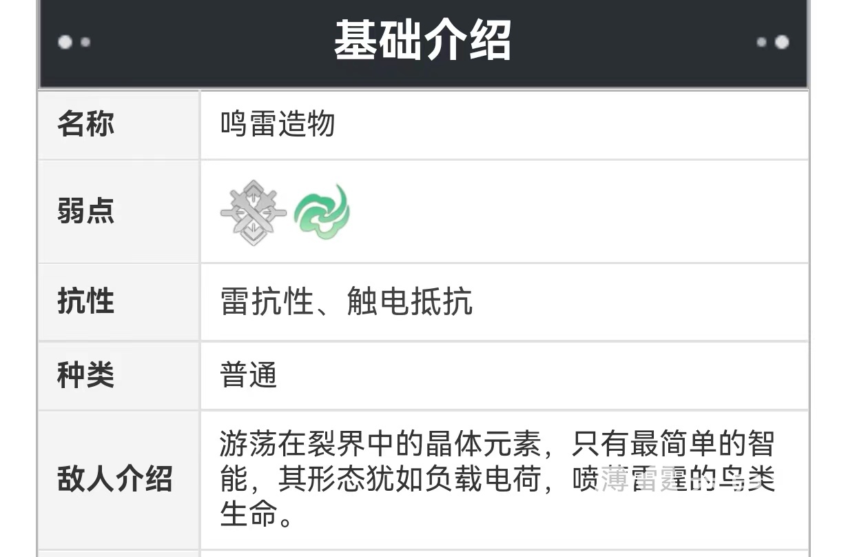鸣雷造物的弱点有2个属性,物理和风系,玩家初始角色毁灭开拓者就可以拿来击破它的弱点,遇到这里怪时,可以靠近后先使用普攻提前破盾,加快进入战斗后的破盾效率。大家靠近怪物后,敌人头上都会显示弱点属性,只要你手速够快,足够在它发现前先下手为强。
