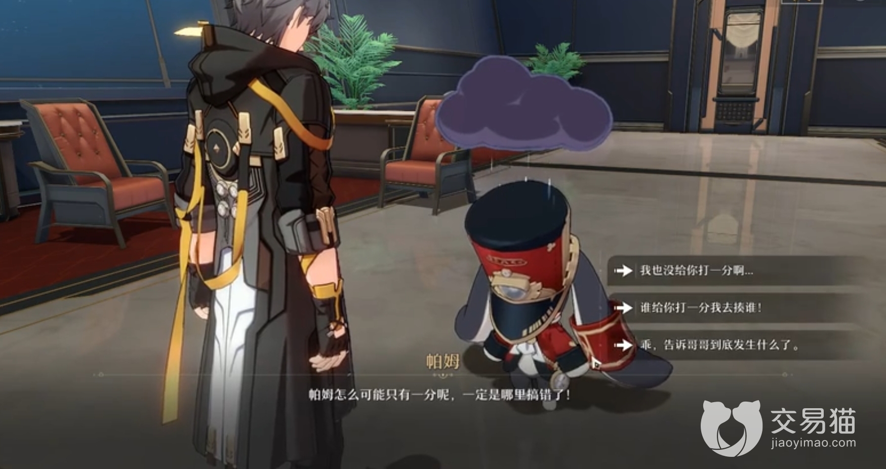 其实选择哪一个都可以,小编给他打了满分哦。之后帕姆口中喃喃自语,说帕姆为什么只有1分,这时候你觉得很诧异会问他怎么回事。原来是有一次三月七向乘客借了一个奇物“定分枪”,它能对一切物体打分,前几天帕姆去问了下,发现自己只有一份。