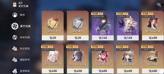 现在在游戏商店里面可以兑换到的货币有信用点,未熄的星芒,未熄的余烬,星琼,星轨专票,以及星轨通票,还有古老梦华。其实星轨专票和通票的区别很大,因为前者只有在限定的卡池里面才能抽到,但是后者可以去常驻的卡池里面。
