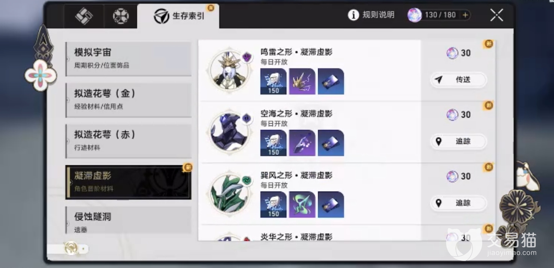 拟造花萼依旧必打。历战余响会掉落行迹和进阶材料,所以大家同样要刷完。30级后,4星遗器差不多得成型了,并分一部分体力用于刷角色进阶材料,凝滞虚影和历战余响。再之后大家可以重点打行迹材料,和历战余响副本。