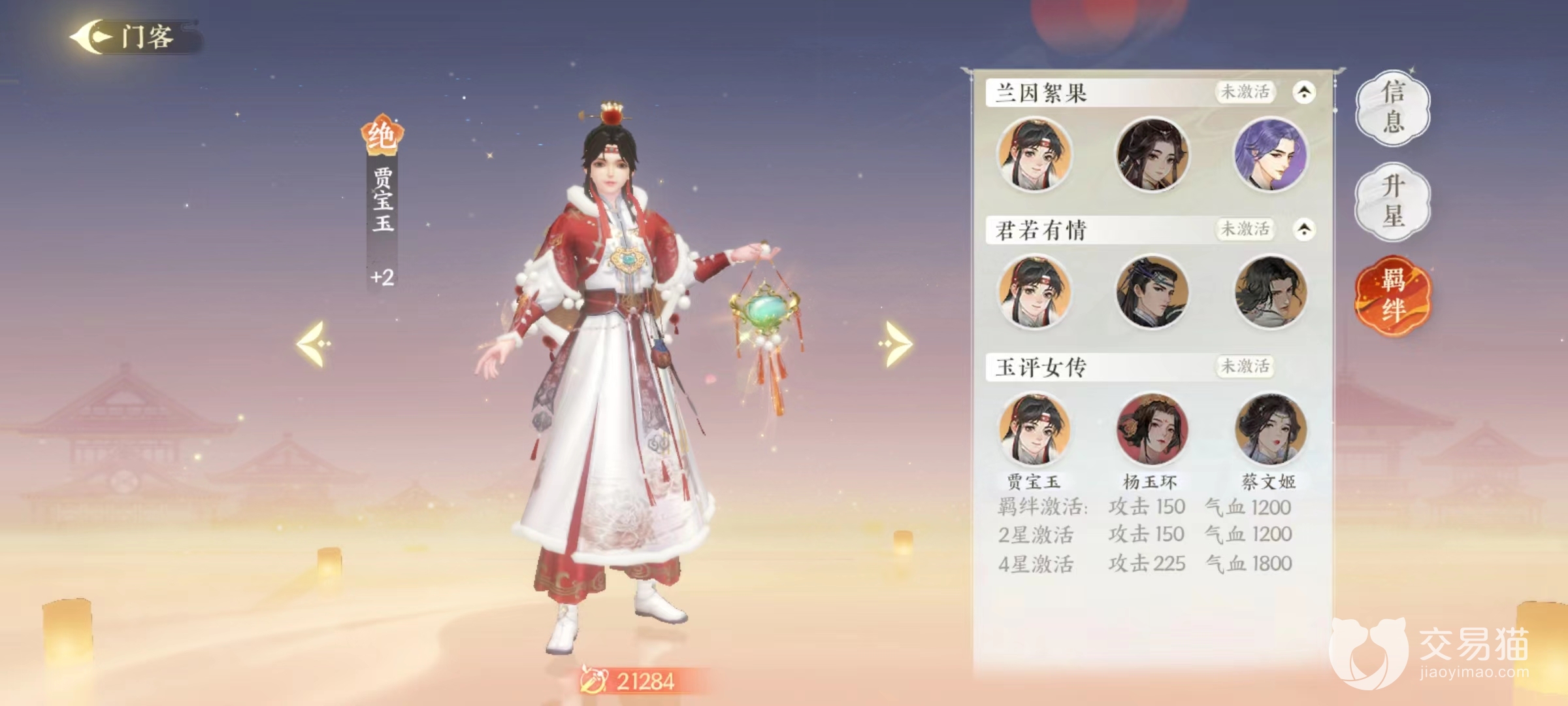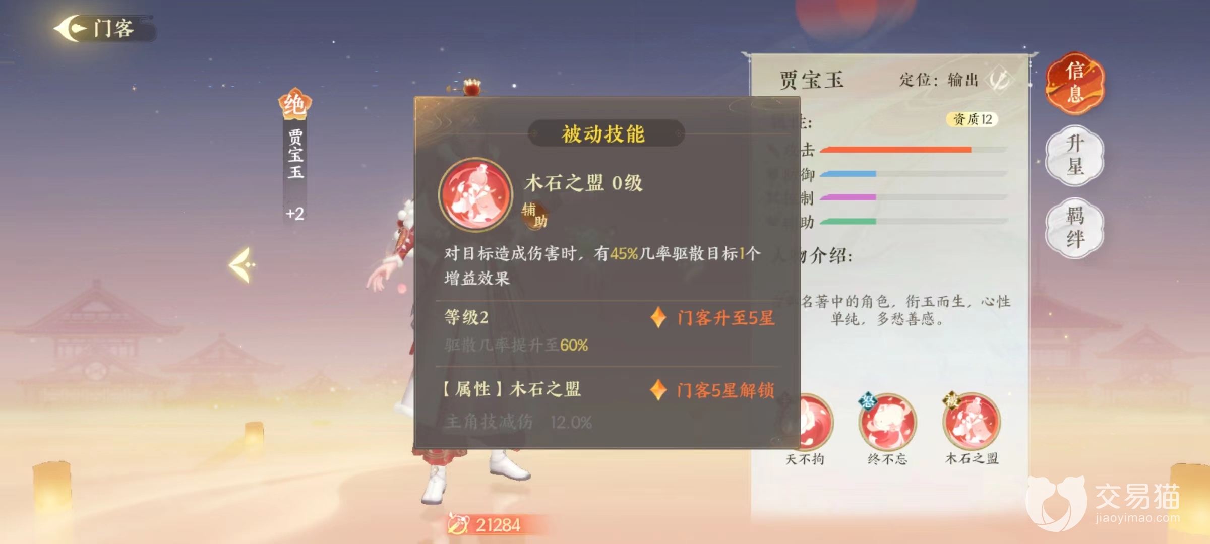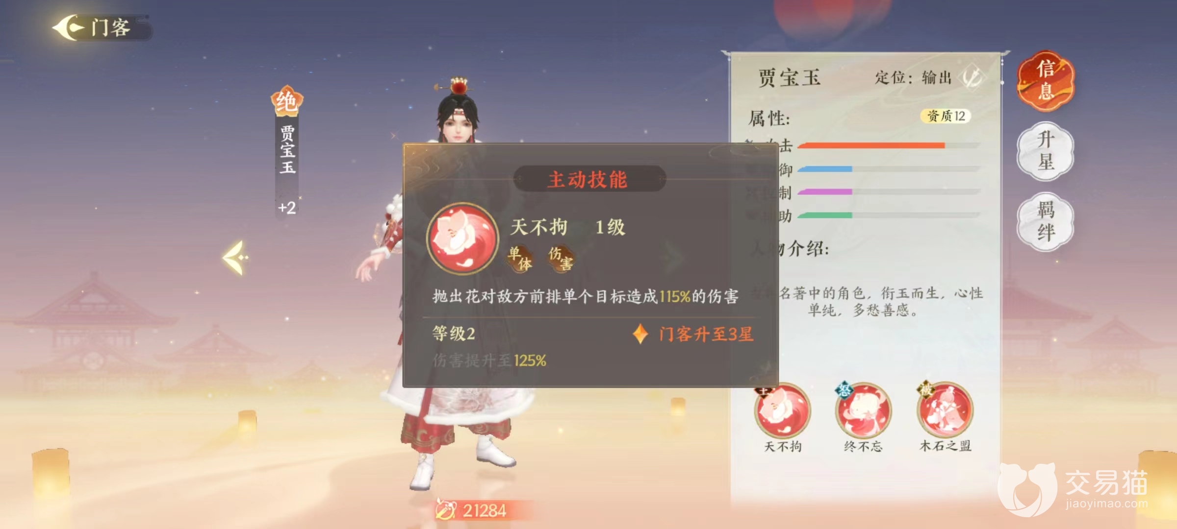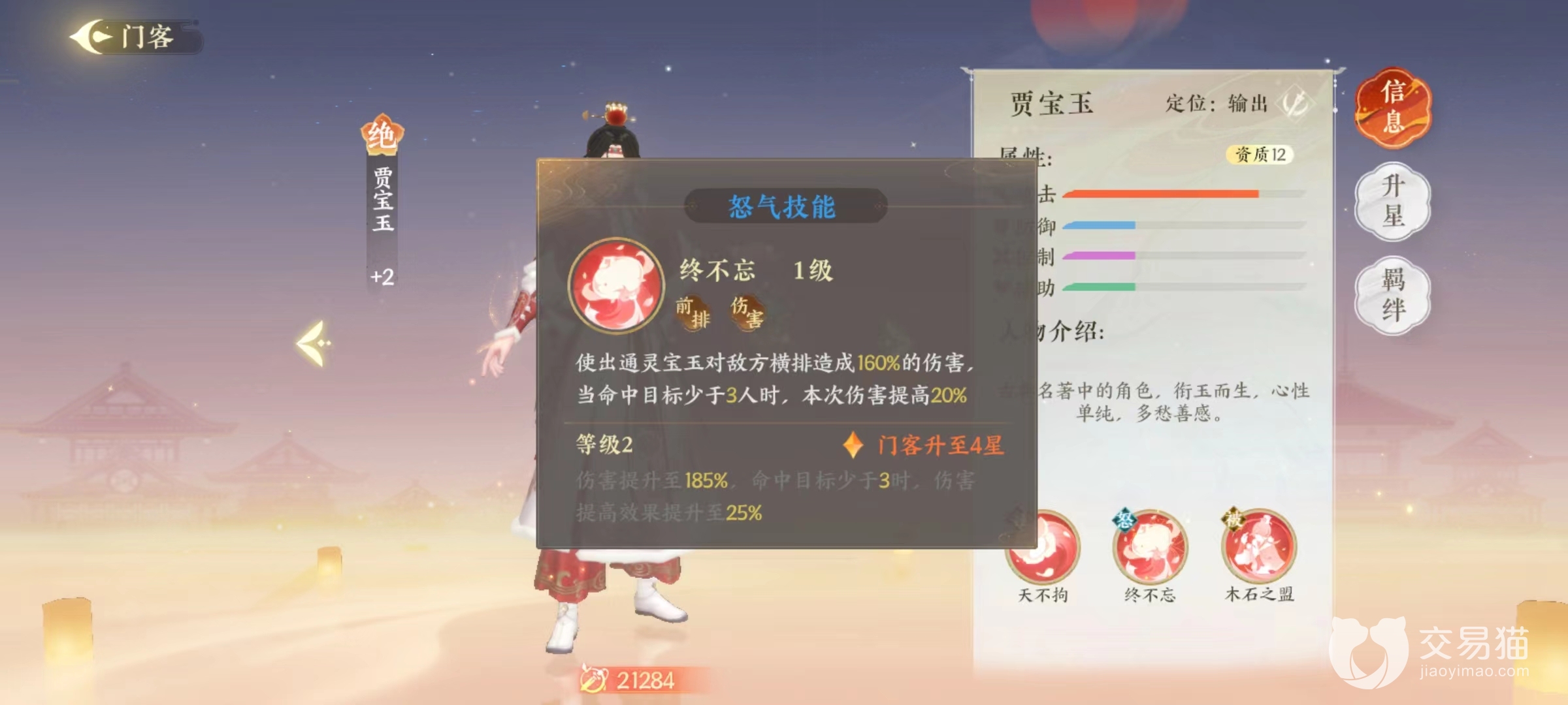 从属性定位方面,就是最单纯的输出,这点从四维属性中就能看出,其他防御、控制和辅助都非常弱,但攻击极其突出。主动技能伤害敌方前排单体目标,造成的伤害中规中矩。怒气技能终不忘,拿出贾宝玉最为知名的通灵宝玉,伤害敌方横排所有单位,如果本次技能攻击目标少于三个人,则伤害提升。当达到4星时技能等级提高,伤害最多能达到185%,额外伤害提升至25%,这也就意味着在攻击较少目标时会有更明显效果,不会造成伤害浪费。