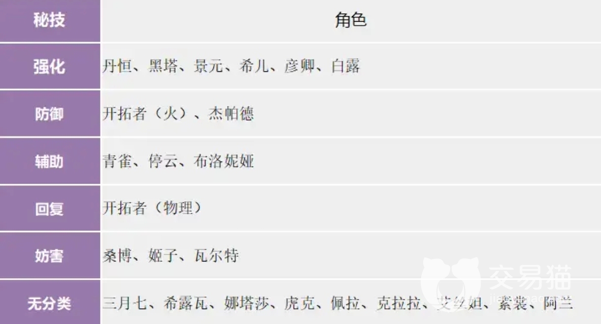 拥有此类型技能的角色都被统称为辅助类角色,比如说可以对队友进行强化的角色有黑塔,景元等等,而防御力的角色有杰帕德和开拓者,也就是玩家自身所操作的主角。可以提供辅助技能的有停云和布洛妮娅辅助是目前游戏内最重要的增益分类。