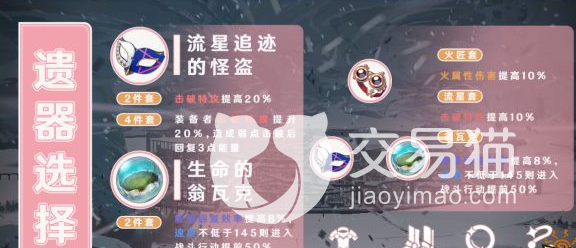 遗器选择最好是,流星追迹的怪盗四件套,还有生命的翁瓦克两件套。前者可以给角色带来击破特工的加成,并且让她可以拥有,弱点击破时的回复能量。后者可以给角色提供能量回复效率的加成,并且还能够让她得到可以提前行动的机会。