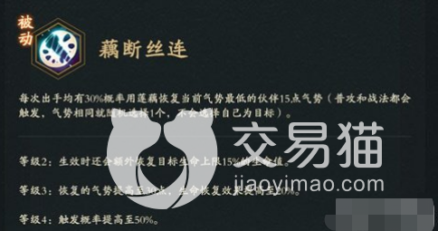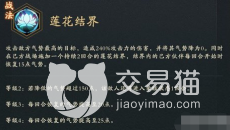 有攻击的同时,还会为己方站队的地方添加一个莲花结界,这个结界在游戏中其实是可以帮助队友加速恢复气势的,所以这个战法是一个自带攻击以及增益效果的战法,要是配合被动的话,其实效果还是不错的,她的被动效果在上面是可以给队友随机增加气势。