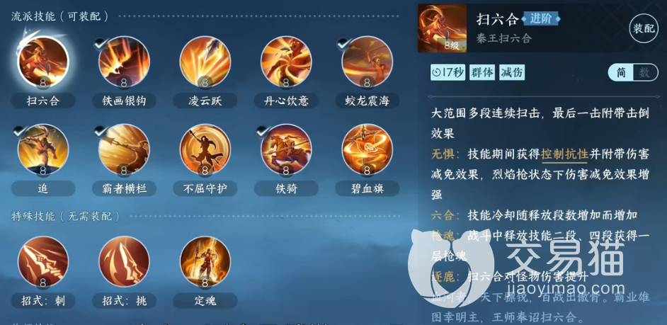 带招式的话,就用刺、挑、追这类技能,要是使用的话大家试试用蛟龙来配一下枪魂丹心等等技能,或者是用铁花跟万夫也可以,带一个位移的技能其实对战的时候是比较爽的,操作的时候注意一下距离,对面拉近距离的时候,就闪,对面跑的时候也可以追,相比其他的技能搭配,这样的效果还算不错。