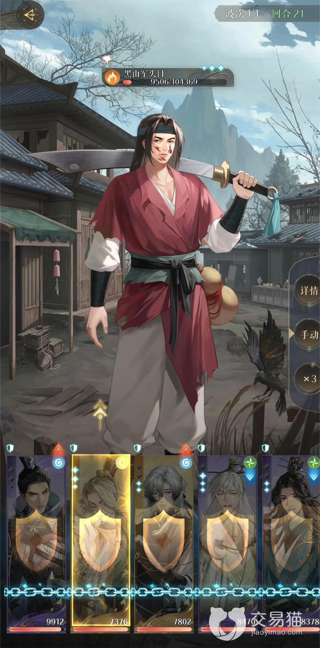 首先是对方阵营,对方只有一个人,黑山军头目,血量10W+,他的技能效果是可以在每个回合对我方一位队友造成伤害反击效果,大招则是会对全体队员造成高额伤害,并且免疫劝退,所以这把起来着实史难受!不过咱不怕,这不攻略来啦!
