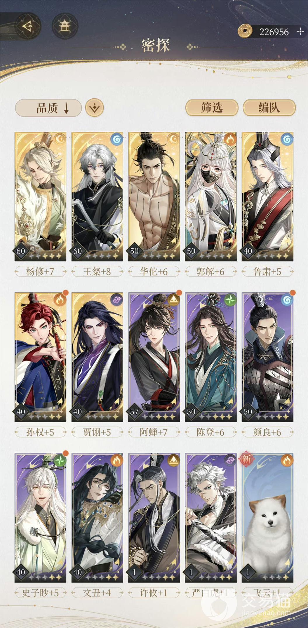 接下来就是编队推荐:颜良+杨修+史子渺+陈登+严白虎,这个阵容练度都不算太高,保证两个60级就可以了,盾护在对线中是很重要的,所以颜良和白虎最好是2星的,陈登的命盘则是加2初始能量,杨修作为输出主力,必须保证练级拉满,大史作为奶妈,命盘最好史洗放大招能够提供防御,不然的话就需要拉等级了。