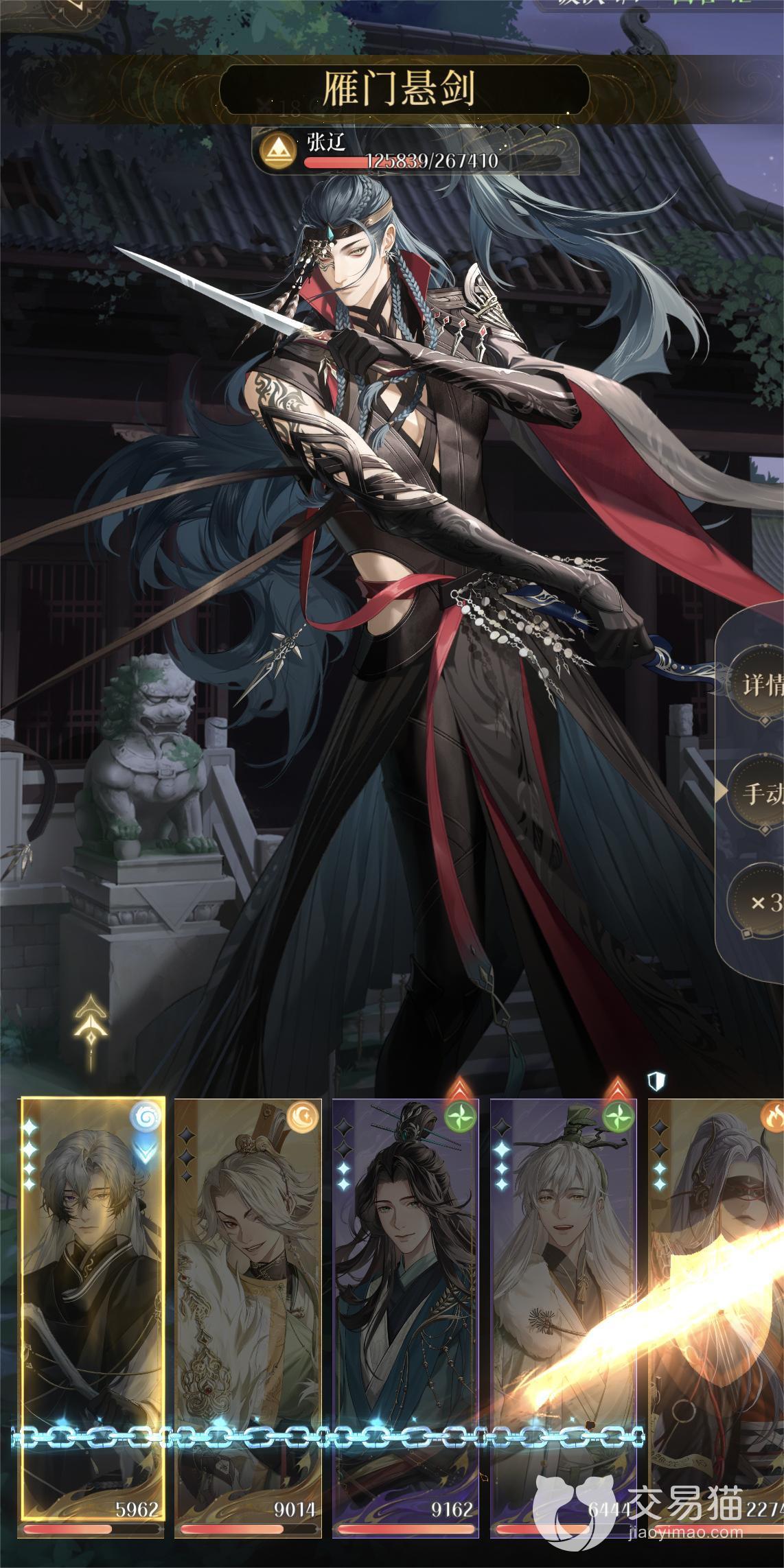 首先惯例还是介绍一下敌方阵营,boss张辽,血量20W+,血条非一般的厚,所以打起来很吃力。张辽的攻击对象是对上一回合采取防御动作的目标,如果没有人防御则会释放群体攻击。张辽的刀人动作还是很好判别的,就是血量太厚,所以咱们可以采取比较迂回的攻击方式消耗敌人的血量。