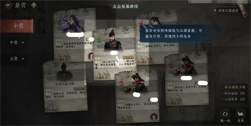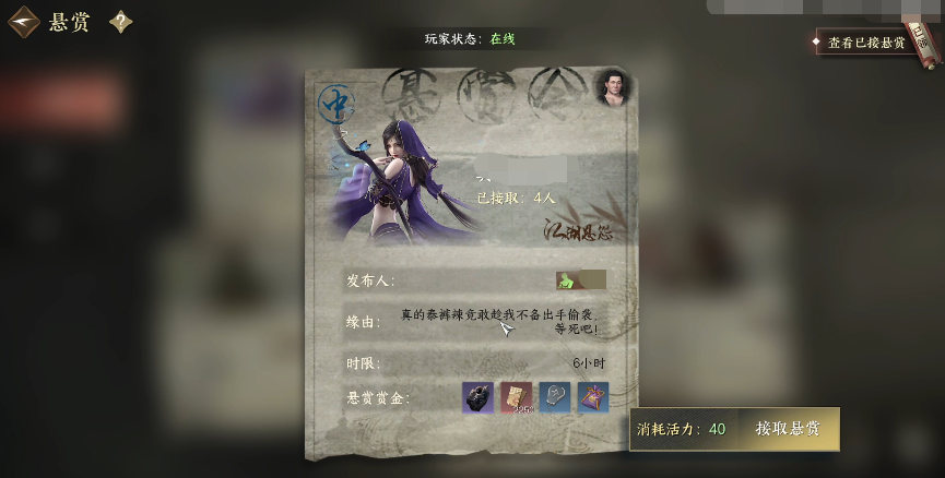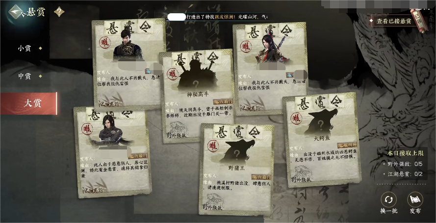 悬赏令根据奖励的程度和被悬赏者的实力分为小中大三挡,其中被悬赏的目标分为两类,一种是野外的强敌,一种则是恶意的玩家,前者出现的地点相对固定,而且本身出招的套路也容易揣测,给的奖励也不是很少,而且每天最多可以接取五个这类悬赏,所以收益非常不错。