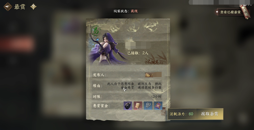 大家想要领取的话直接点进悬赏界面,找到带有“野外强敌”标识的悬赏令点击接取即可,不过需要注意的是每次接取这些悬赏都是需要消耗一定活力的,因此在进行这类悬赏之前最好先看一下自己的活力是否充足。