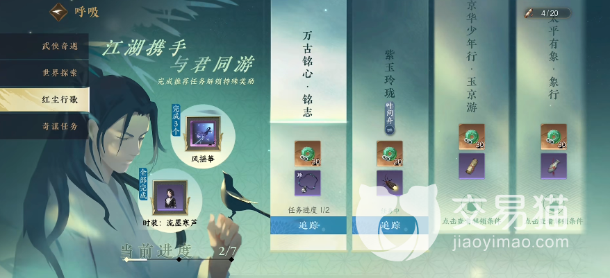 在剧情当中,其实玩家已经短暂的加入过相思门,不过之后想再次加入那么就需要先如上图所示来到杭州坐标(1017,942)的位置,这个位置算是一个奇遇的触发地点,不过触发之前需要先准备一个动作,这个动作并非默认开放的动作,它的名字是“风摇筝”,需要玩家在“呼吸”界面中找到“红尘行歌”板块。