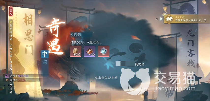 施展完毕之后,就会出现奇遇触发的字样,之后就会出现一系列的任务指示,玩家只需要跟着这些指示走完对应的剧情流程即可解锁相思门,这中途没有什么特别困难的事宜,基本上只要你获取了风摇筝,后续凭借自带的实力都是可以轻松应付的,加入相思门的好处还是不少的,其中包括相思剑法以及各种培养资源都应有尽有。