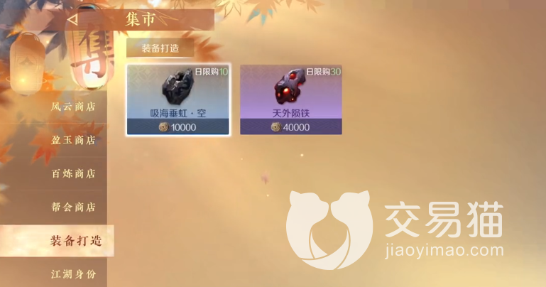 然后就是帮会商店,需要花费帮会点才能兑换里面的物品。里面最值得兑换的就是时装,看上去还是很时尚的。之后就是装备打造,使用铜钱就可以兑换打造装备的材料。最后江湖身份就是一些消耗品。
